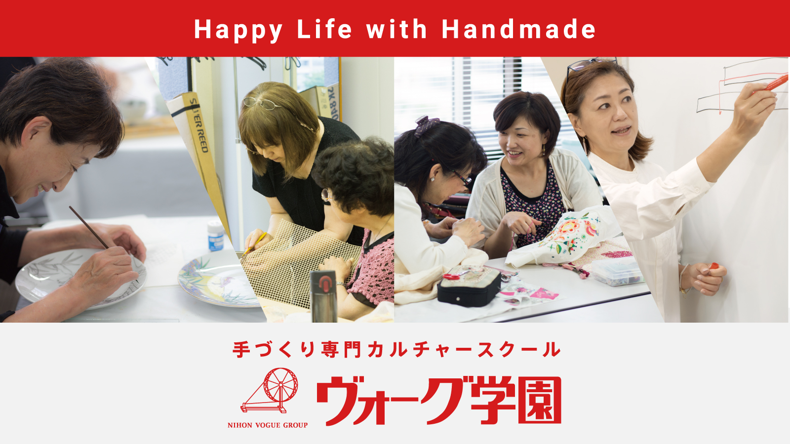 ヴォーグ学園は、ハンドメイドを通じ、楽しみ、学び、創りながら、生活をハッピーにしたい、生活に彩りを与えたいという気持ちで数多くの講座を展開しています。