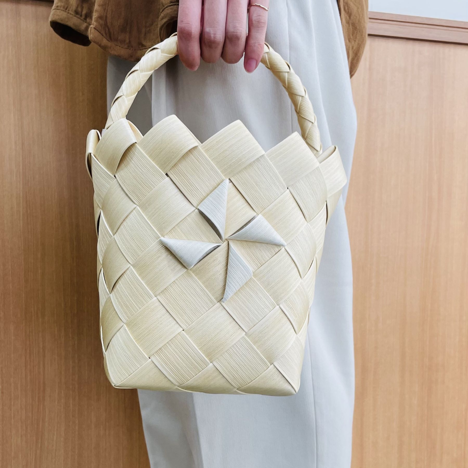 北欧の白樺かごをイメージして作った素材Timb.テープを使ったかご編みのレッスンです。樹脂を主原料にしたテープは、水に強く、汚れても洗える衛生的な素材です。割いて使うこともでき、ささくれもないので手に優しく、実用的な作品がお作り頂けます。