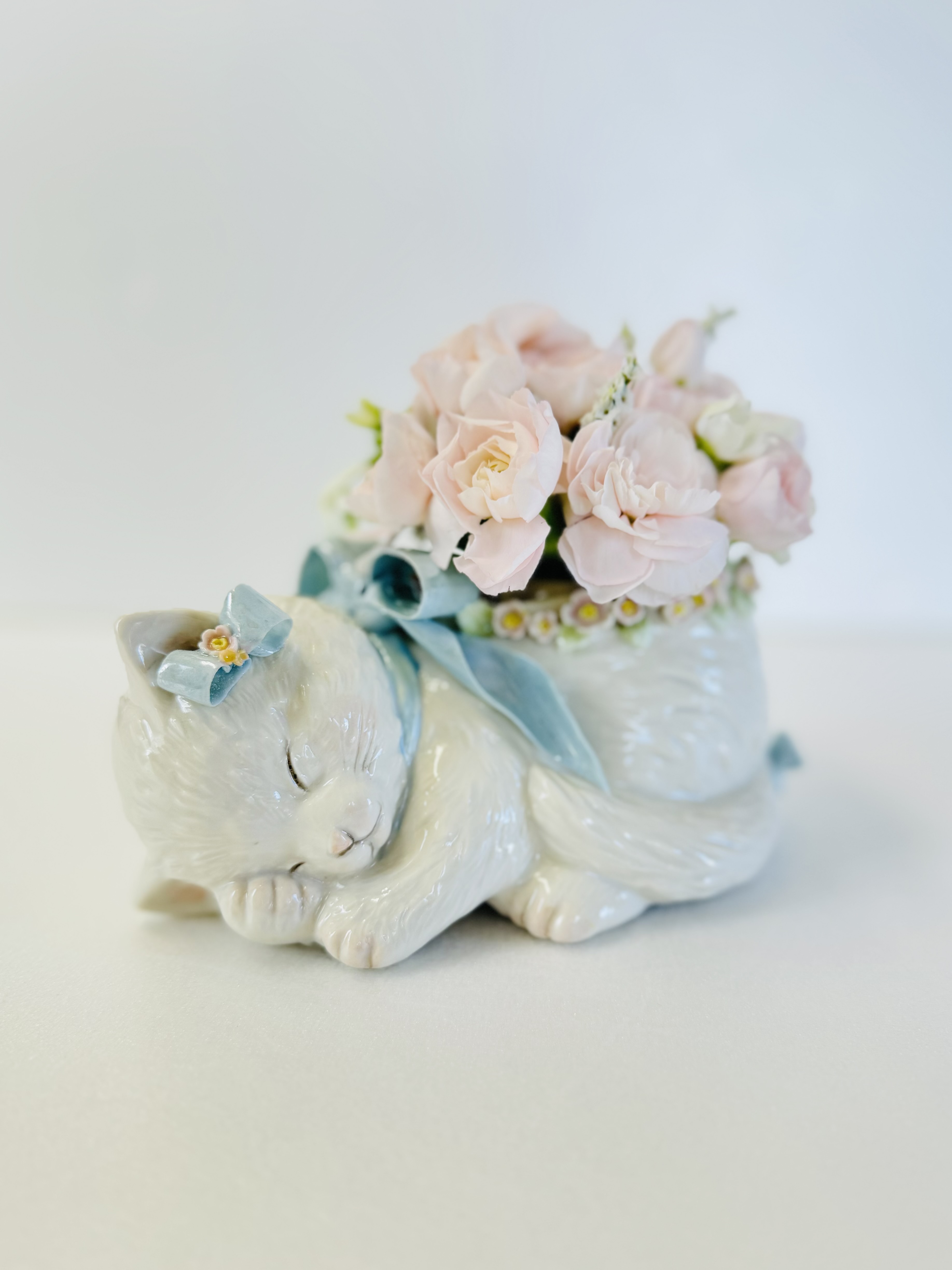 見ているだけで心がほんわかするネコちゃんのフラワーポット。体験レッスンでは、 磁器土を使って、リボンやお花を作って飾ります。終了後、講師が焼成し、仕上げます。作品のお渡しは、約ひと月後になります。