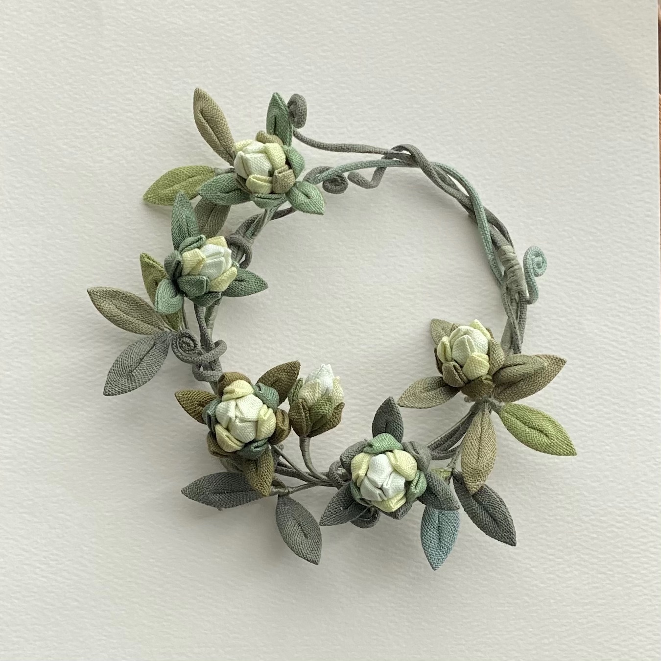 基本の丸つまみのブローチから始め、複数の花や葉を糸で束ねる組み上げでインテリアのかざりものを仕上げます。